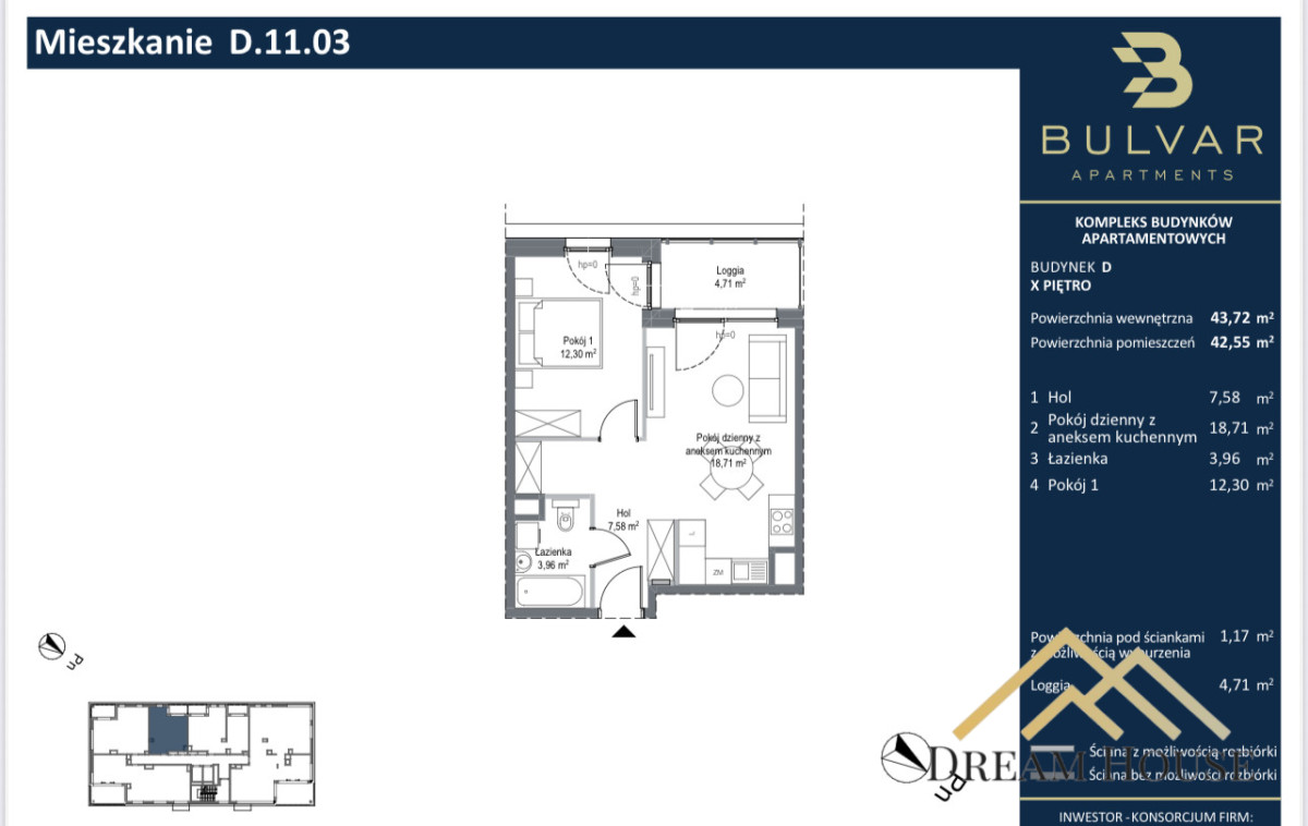 Przedstawiamy na sprzedaż apartament o powierzchni 43,79 m2, na prestiżowym osiedlu Bulvar.