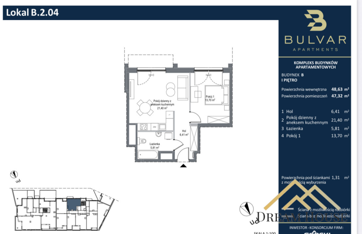 Przedstawiamy na sprzedaż apartament o powierzchni 48,71 m2, na prestiżowym osiedlu Bulvar.