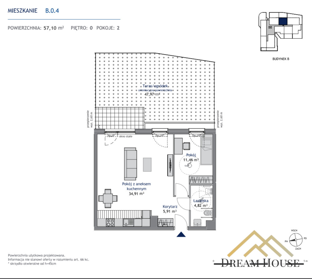 Dwupokojowe mieszkanie o powierzchni 57,10 m² to propozycja dla osób poszukujących komfortu i funkcjonalności w nowoczesnym wydaniu. Położone na parterze inwestycji LINEA, wyróżnia się dobrze przemyślanym układem i wygodnym dostępem do ogródka (49,97 m²), który pozwala cieszyć się zielenią i chwilą relaksu na świeżym powietrzu. Salon z aneksem kuchennym (34,93 m²) daje szerokie możliwości aranżacji i sprzyja wspólnemu spędzaniu czasu.