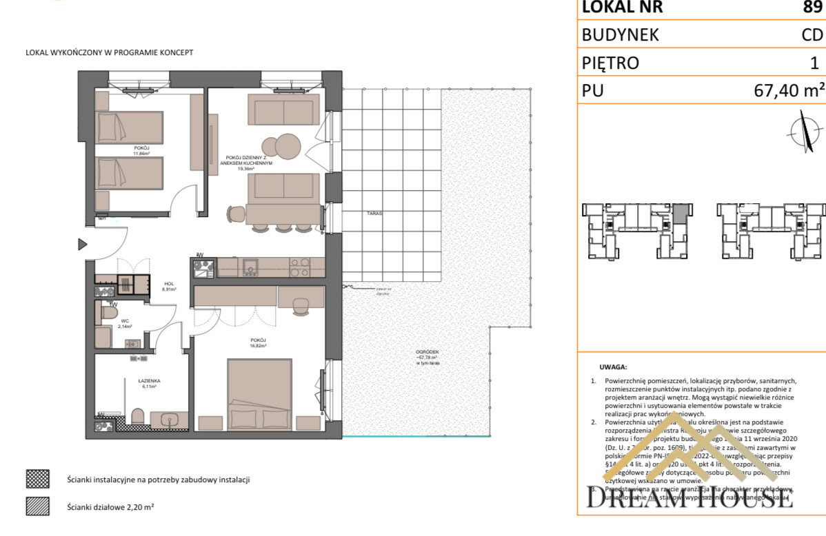 Na sprzedaż 3-pokojowe mieszkanie o powierzchni 67,40 m2 wraz z tarasem i ogródkiem o powierzchni 57 m2 w którego skład wchodzi: