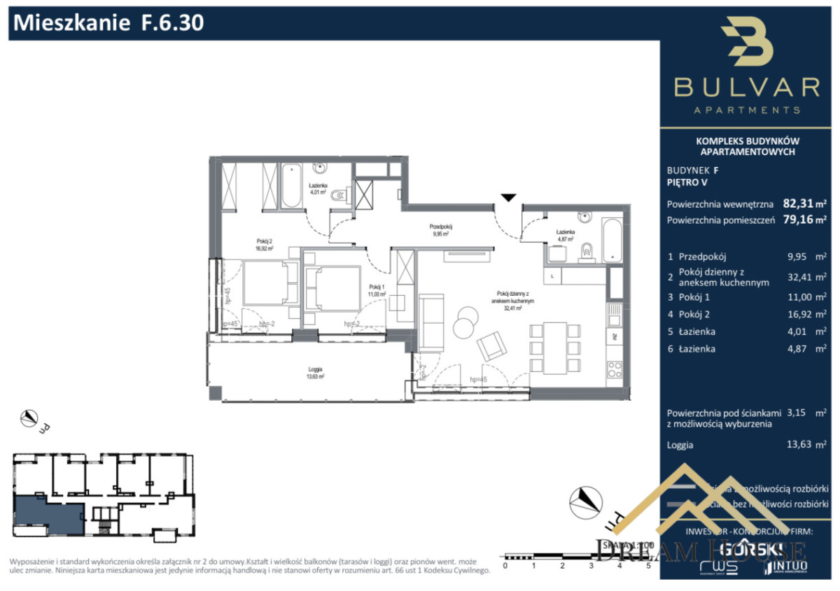 Na sprzedaż apartament 3-pokojowy o powierzchni 81.67 m2 w budynku F składające się z: