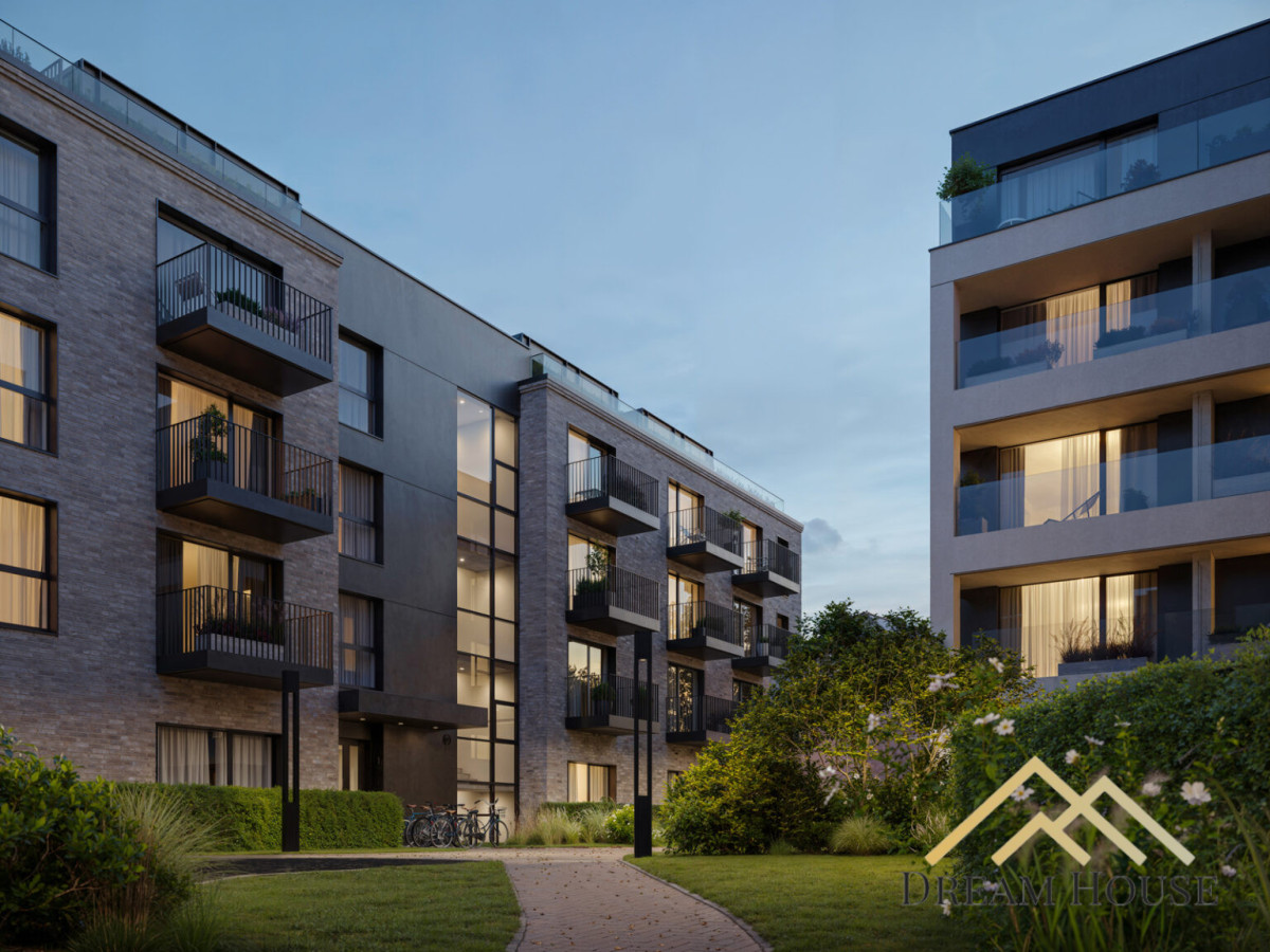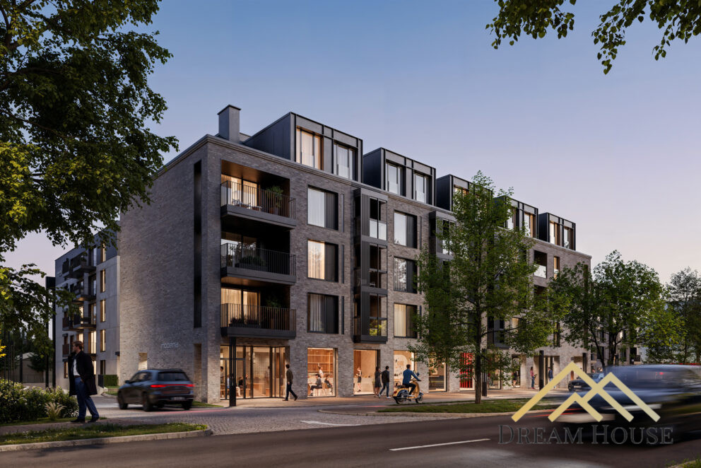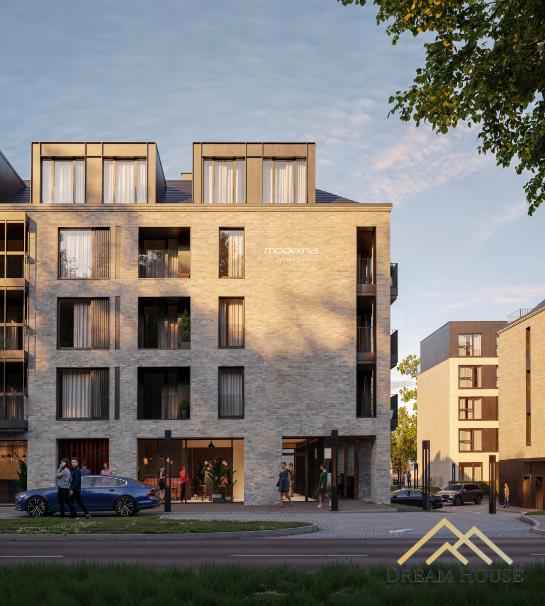 Znajdziemy tutaj jasną klinkierowaną cegłę o szaro-beżowym zabarwieniu, duże portfenetry w ciemnej oprawie stolarki okiennej, uporządkowaną, wyważoną tektonikę, rytmicznie rozmieszczone loggia i balkony, co składa się na dyskretną, minimalistyczną całość. U szczytu, bliżej koron drzew, linię odcięcia tworzą stalowe balustrady oraz lukarny z przestronnymi oknami, a także charakterystyczne mansardowe dachy. To przykład nowoczesnej interpretacji modernistycznej idei skupionej wokół funkcjonalności, czystych linii oraz integracji pomiędzy przestrzeniami wewnętrznymi i zewnętrznymi.