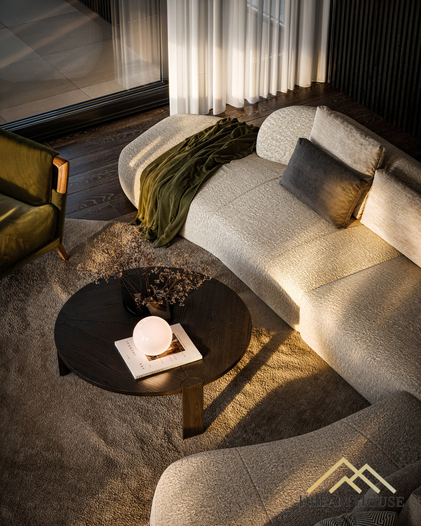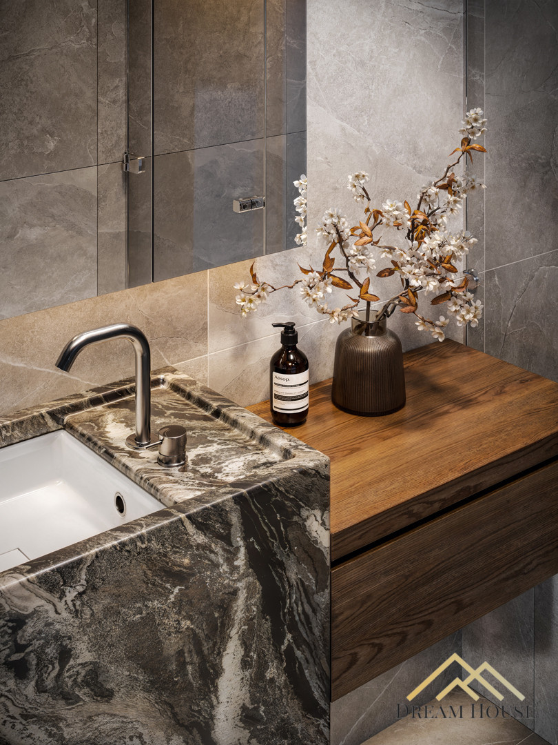 Zmysłowa gra różnych faktur oraz naturalnych materiałów składa się na kompozycję pełną architektonicznej głębi. Ciepła tonacja skontrastowana z surowością kamienia i drewna, wzbogacona kolorem o żywym, intensywnym odcieniu, wprowadza do przestrzeni wspólnej ożywczą szlachetność. Wyrafinowanie nie wynika tutaj z dosłowności, lecz z dyskretnego perfekcjonizmu dobranych elementów. Każdy detal o unikatowej wartości estetycznej stanowi znaczący moment przejścia do swojego mieszkania.